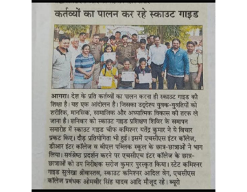 आगरा। देश के प्रति कर्तव्यों का पालन करना ही स्काउट गाइड की शिक्षा है। यह एक आंदोलन है। जिसका उद्देश्य युवक-युवतियों को शरीरिक, मानसिक, सामाजिक और अध्यात्मिक विकास की तरफ ले जाना है। शनिवार को स्काउट गाइड प्रशिक्षण शिविर के समापन समारोह में स्काउट गाइड चीफ कमिश्नर यतेंद्र कुमार ने ये विचार प्रकट किए। दौड़ प्रतियोगिता भी हुई। इसमें एचसीएस इंटर कॉलेज, डीआर इंटर कॉलेज व बीएल पब्लिक स्कूल के छात्र-छात्राओं ने भाग लिया। सर्वश्रेष्ठ प्रदर्शन करने पर एचसीएच इंटर कॉलेज के छात्र- छात्राओं को उप निरीक्षक सरोज कुमार पुरस्कृत किया। स्टेट कमिश्नर गाइड सुलेखा श्रीवास्तव, स्काउट कमिश्नर आदिल वेग, एचसीएस कॉलेज प्रबंधक ओमवीर सिंह यादव आदि मौजूद रहे।